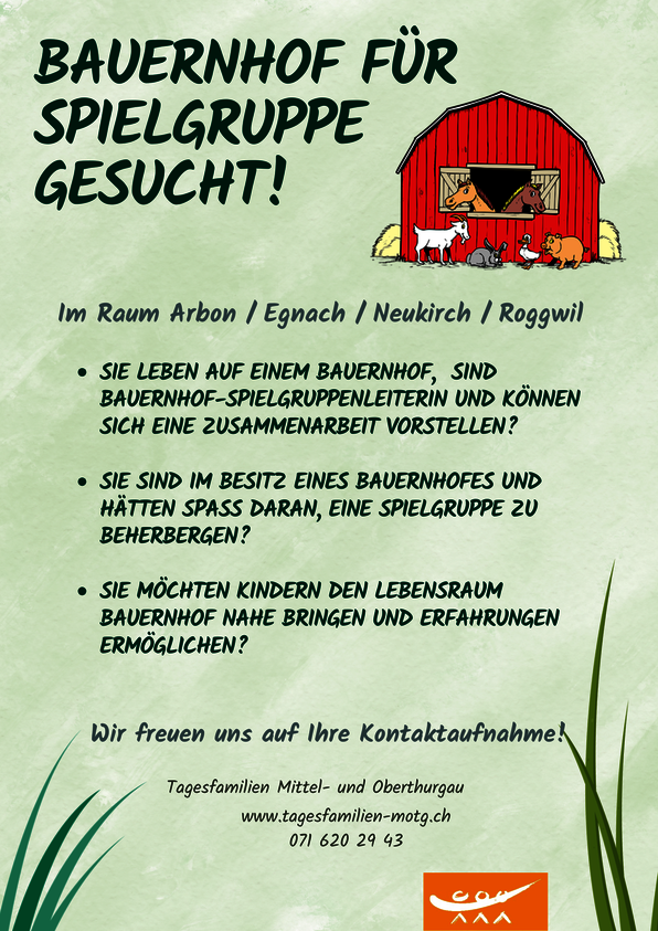 Der Standort unserer Bauernhofspielgruppe Allwetterknirpse in Frasnacht-Kratzern wird ab dem neuen Schuljahr 2026/2027 aufgelöst. Gerne würden wir Kindern weiterhin die Gelegenheit geben, die Welt des Bauernhofes kennen zu lernen und Erfahrungen mit Tieren, Pflanzen und Natur im Allgemeinen zu ermöglichen.